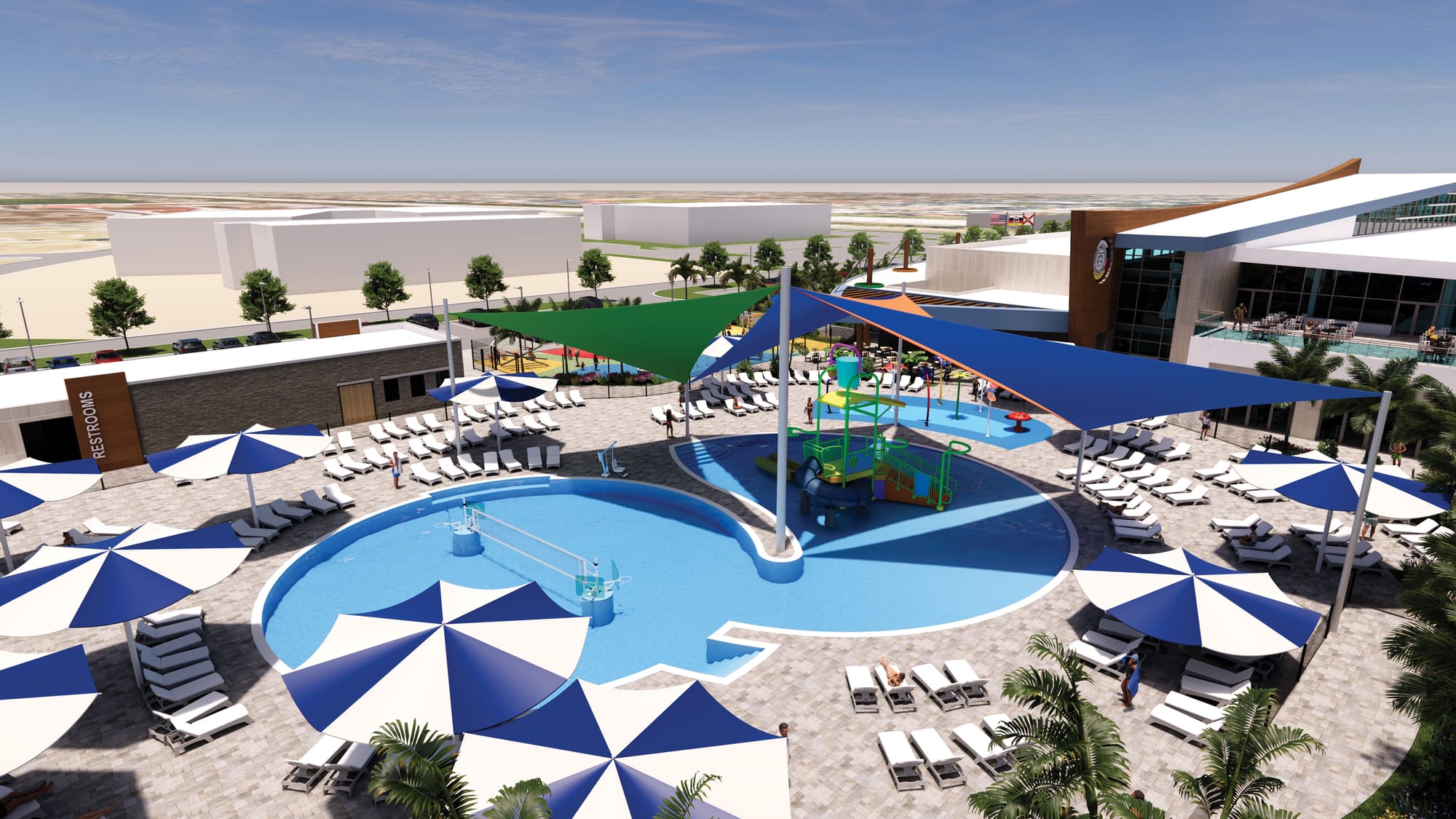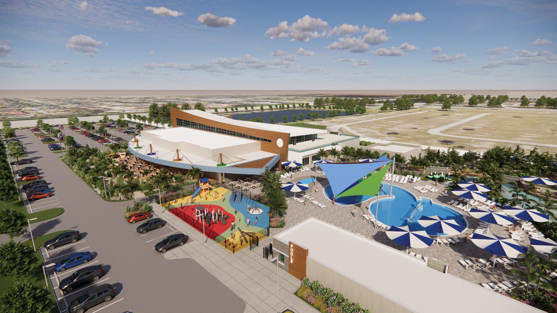 The center features a wide range of amenities, including a 560-seat banquet hall, flexible meeting rooms, arts and gaming spaces, and a teen and kids’ zone. A full fitness level offers group studios, cardio and circuit training, a walking track, and access to a rooftop patio. The adjoining aquatic complex includes an adult pool, a kids’ pool, a lazy river, waterfalls, a splash pad, and shaded pavilions.