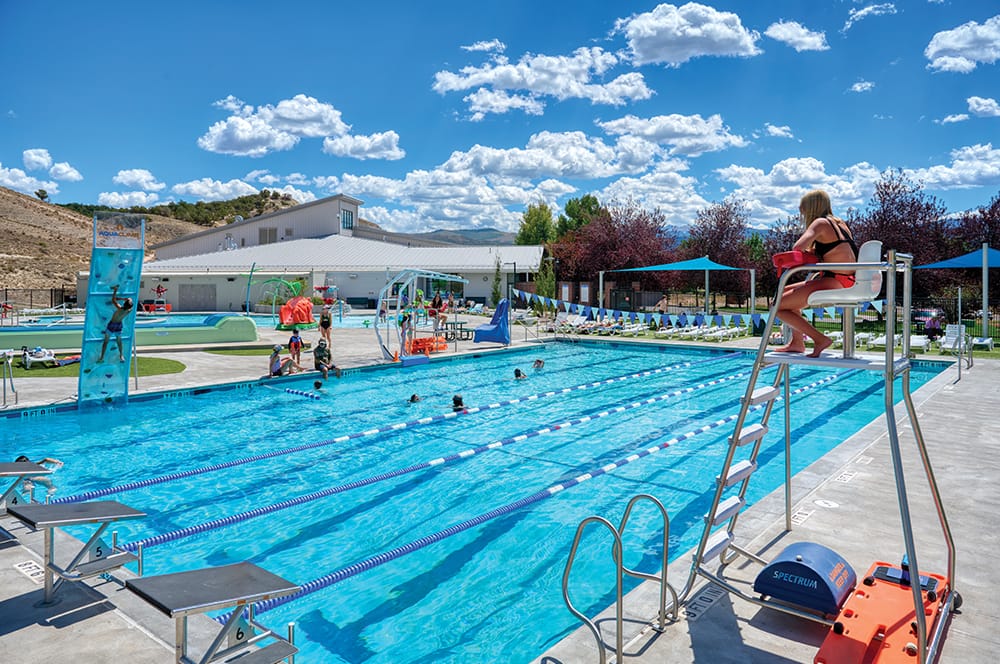 The Town of Eagle and Mountain Recreation District partnered to replace the existing outdoor pool at the Eagle Pool & Ice Rink. The new outdoor aquatics area nearly doubles the previous water surface area and features two distinct bodies of water: a 6-lane, 25-yard lap/exercise/competition pool and a 4,500-square-foot leisure pool with zero-depth entry, current channel, sport area, and expanded water play features. The facility also includes two new water slides, four family changing rooms, shade structures, new lounge seating, and the return of Willy the Frog. Additional amenities like basketball hoops, ziplines, and interactive play elements further enhance the family-friendly aquatic experience.