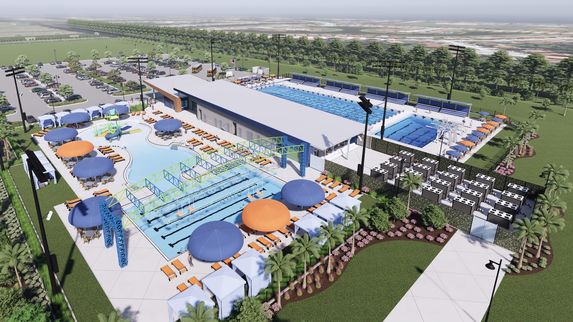 Facilities include a 7,500-square-foot air-conditioned pool house with a concession stand, party room, locker rooms, family changing rooms, and administrative spaces. The site features a covered drop-off, shaded concession areas, a separate equipment yard, ample deck space, shade structures, spectator seating, umbrellas, rental cabanas, and parking for vehicles, buses, and bicycles.