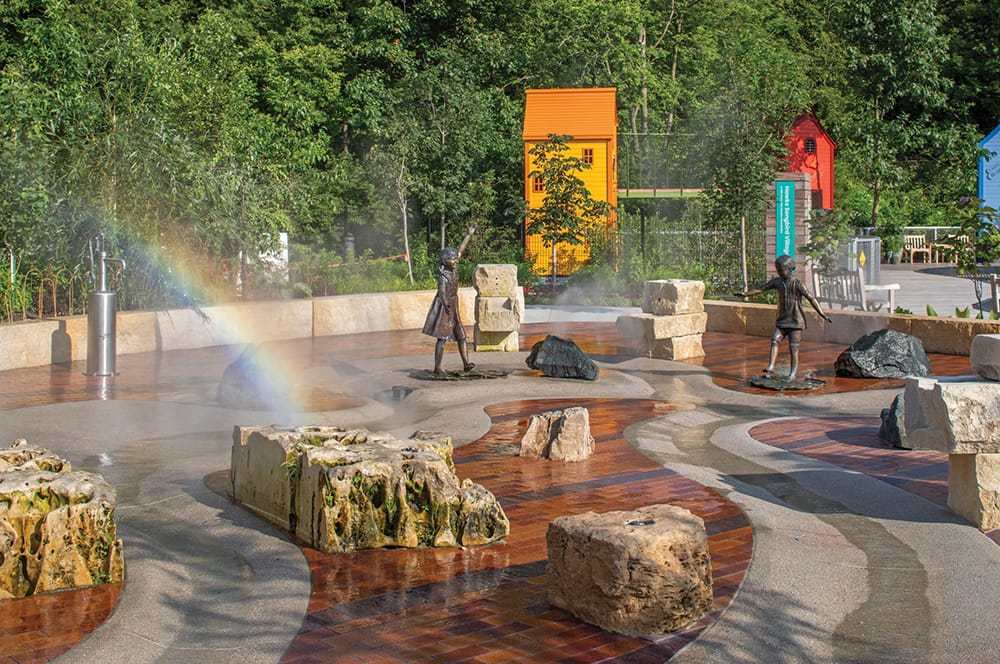 The water play area, the Hager Family Springs, offers a refreshing spot to cool down. It also serves the greater Lauritzen Gardens by cycling water through the play area, capturing it in a series of ponds and wetlands, and using it for irrigation, ending in a gray water system.