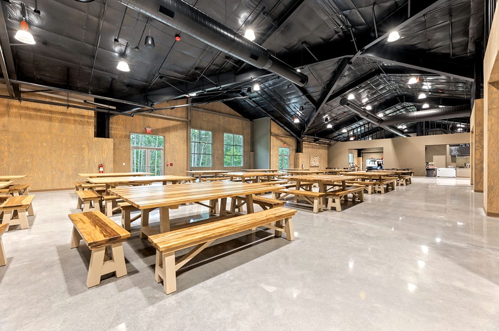 Inside, the two new buildings are a blend of form and function. Large, open spaces are framed with exposed structure and finished with stained plywood, creating a warm, rustic atmosphere that feels at home in the East Texas woods. The Meeting Hall is equipped to support group gatherings, worship services, and teaching sessions, while the Dining Hall dramatically expands the camp’s capacity for food service.