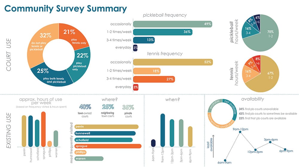 A survey of nearly 1,000 Wellesley residents revealed a weekly pickleball participation rate of 49% (Figure 2). Considering the national average of one pickleball court for every 2,000 residents, the team recommended that the town construct an additional four dedicated pickleball courts over time. This would help alleviate the programming and availability pressures that the town’s recreation department faced. The central question, therefore, was how best to determine where the courts should be located without negatively impacting neighbors.