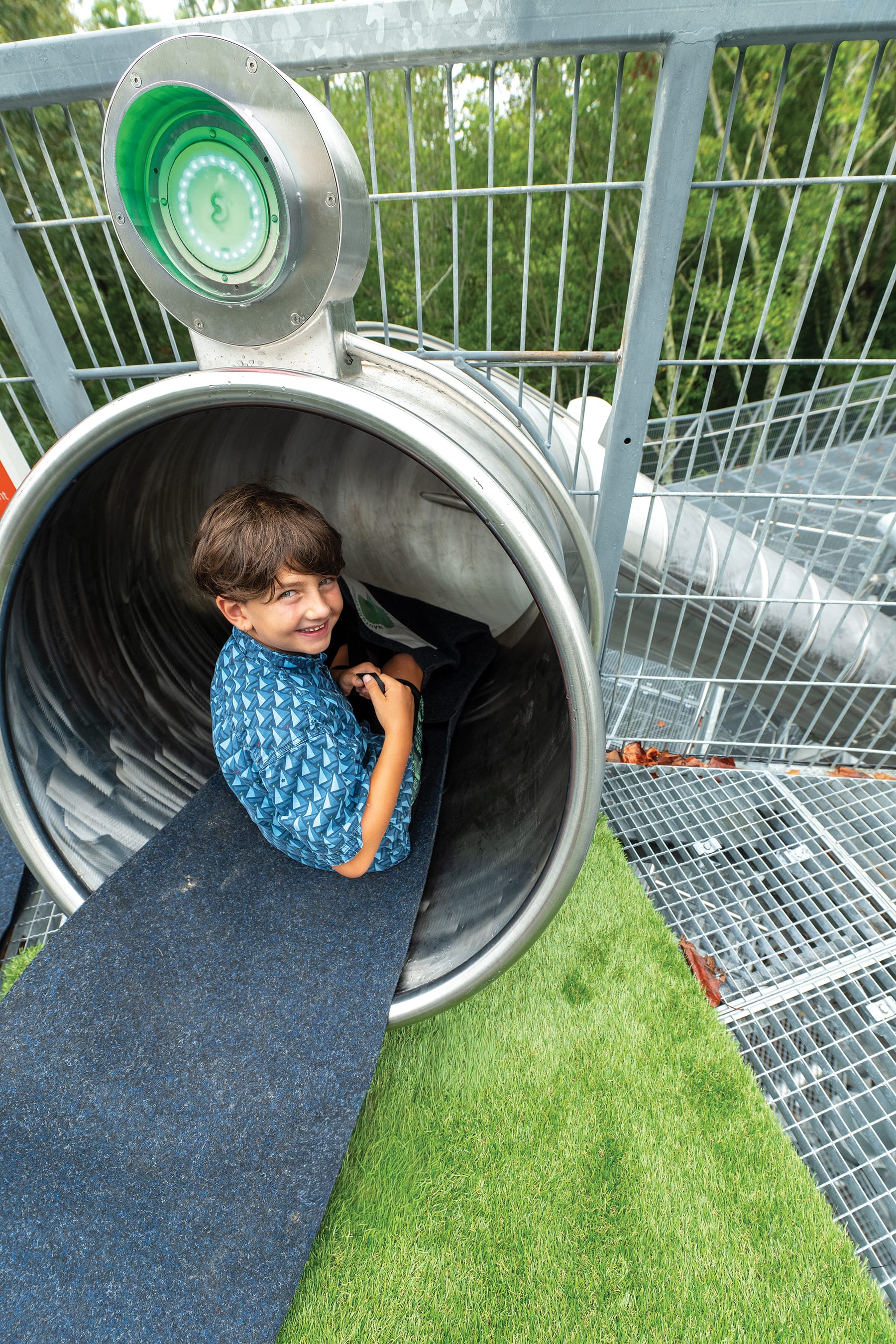 The 80-foot-diameter, 65-foot-high Nautilus Lookout Tower—modeled after popular European designs and the first of its kind in the U.S.—allows guests to ascend into the trees via a gentle, seven-foot-wide spiral ramp or a pair of interior staircases. Educational stations identifying native trees and wildlife are displayed along the path, and an open-air observation deck at the summit provides 360-degree bird’s-eye views of the surrounding forest and waterways. With the addition of “The Whorl” spiral slide, visitors age 7 and older can opt for a thrilling twist down through the tower’s center for a unique descent.