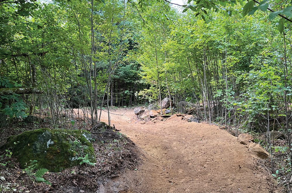 In Gorham, the Coos Cycling Club and Gorham Land Company partnered to add approximately 1.5 miles of new trail that climbs from Gorham up toward the White Mountain National Forest and essentially looks like a lollipop. One section of the new trail will be open for bi-directional travel, while another will be optimized for downhill travel. The bi-directional side of the trail is now open, and the downhill section will be completed next spring.
