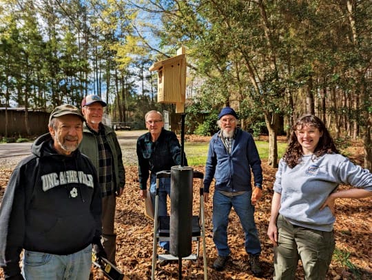 Conservationists brought new, custom-branded bluebird houses to Wake County’s Crowder Park in Apex, N.C., in 2023. The team worked with Sarah Goldsmith, Park Technician of Education at the park, to identify and replace 11 old houses that had deteriorated and were no longer usable. Jeff Allen led the way with a unique pole and critter guard design that he developed and carefully hand-crafted at his home. He also hand-branded each of the new bluebird boxes. The team of Sarah Goldsmith, Jeff Allen, John and Beth Kinsella, Chad Chandler, Bill Willis, and Monty Morée removed the old structures and installed the new boxes throughout the park.